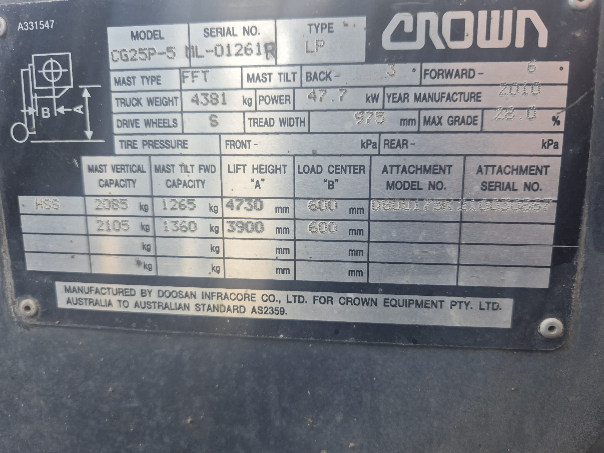 2010 Crown 2.5T LPG Counterbalance Forklift in great condition, comes with: