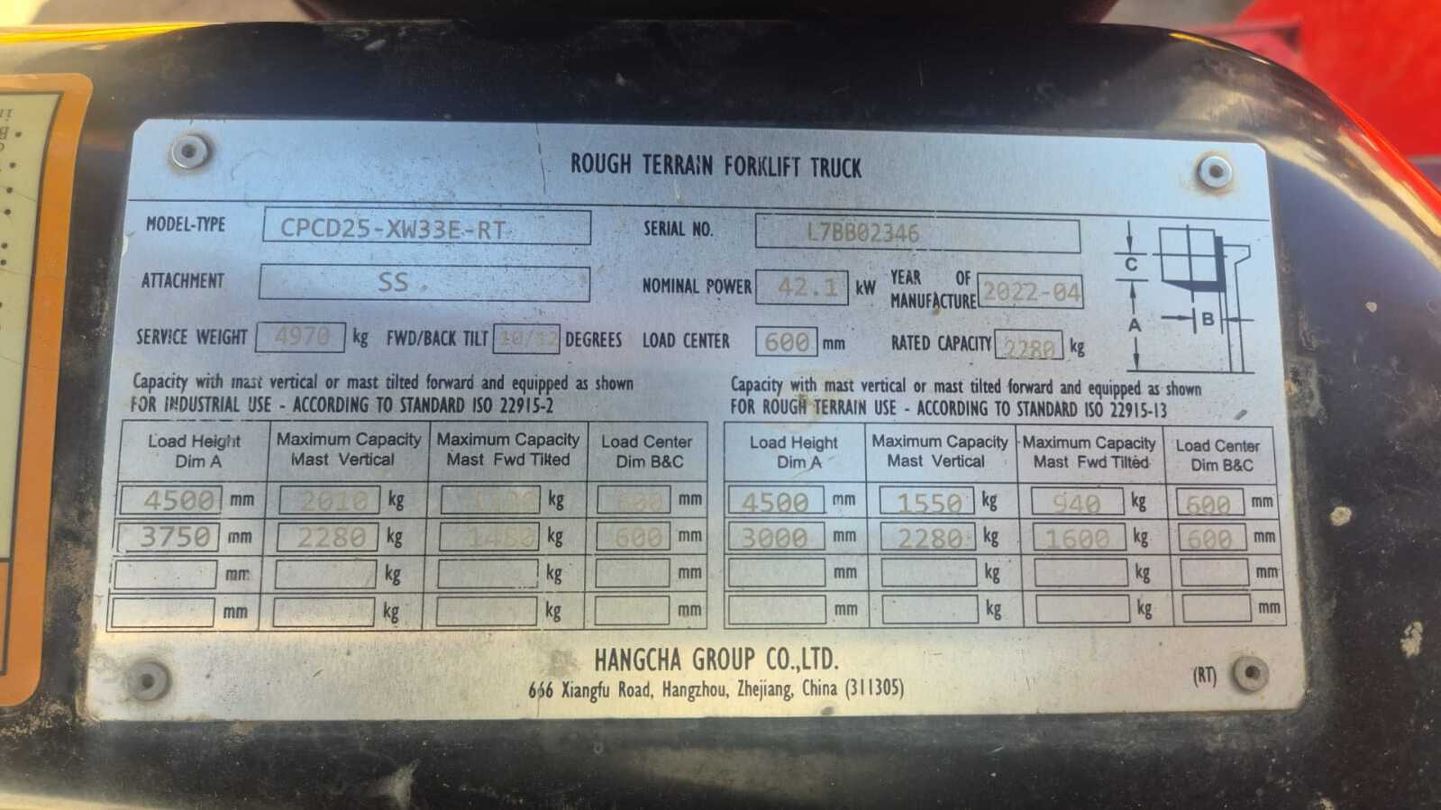 2022 Hangcha 2.5T LPG Rough Terrain Forklift in great condition, features are: